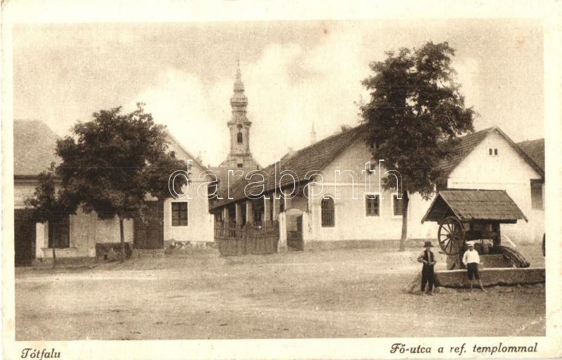 Tótfalu, Tahitótfalu; Fő utca, református templom, kerekes kút (EB) https://www.darabanth.com/hu/361-Gyorsarveres/361.0/Kepeslapok/Magyarorszag~1500006/Totfalu-Tahitotfalu-Fo-utca-reformatus-templom-kerekes-kut-EB~II1875963