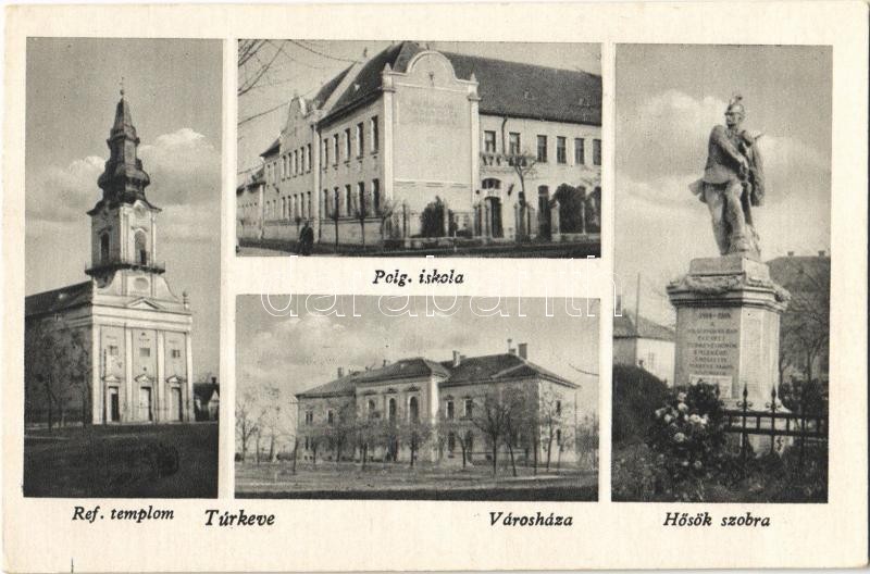 Leírás: Túrkeve, Református templom, Városháza, Polgári iskola, Hősök szobra, emlékmű