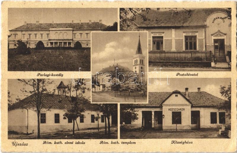 Leírás: Újszász, Parlagi kastély, Posta hivatal, Római katolikus templom és elemi iskola, Községháza (EK)