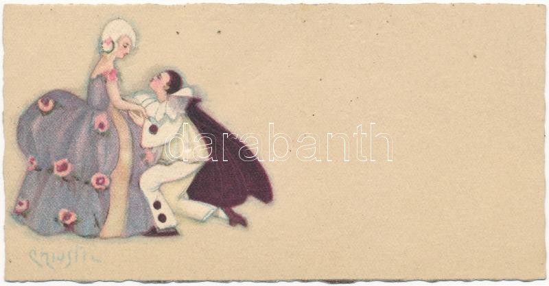 Leírás: 1931 Italian art minicard, lady with clown s: Chiostri (11,7 x 6 cm) (non PC)