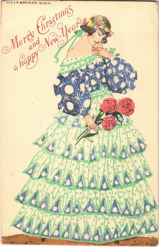 Leírás: Merry Christmas and a Happy New Year! Lady with roses. B.K.W.I. 178-3. s: Mela Koehler (EK)