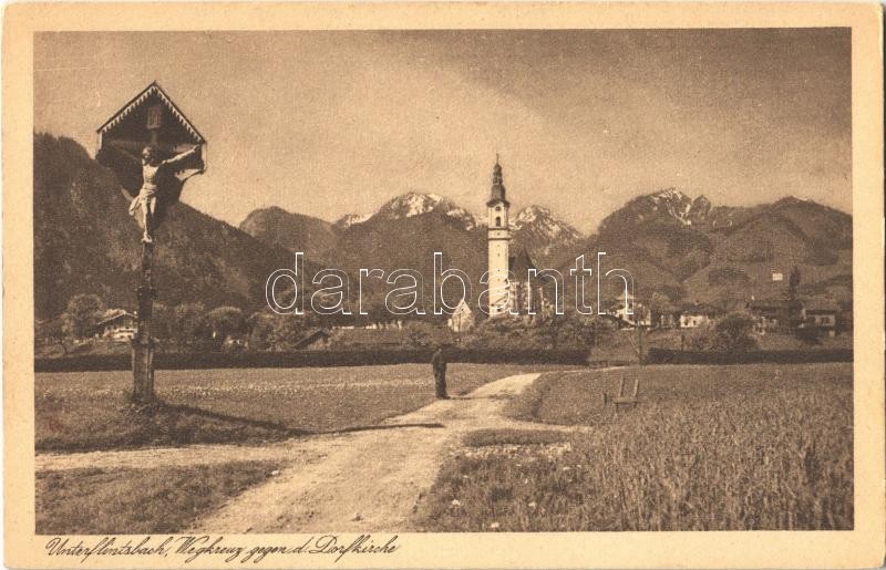 Leírás: Unterflintsbach (Flintsbach am Inn), Wegkreuz gegen die Dorfkirche, Wendelsteingruppe / cross, church, mountains