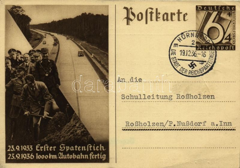 1933 Erster Spatenstich - 1936 1000 km Autobahn fertig / 1933 First Groundbreaking - 1936 1000 km highway completed. Adolf Hitler, NSDAP German Nazi Party propaganda. 6+4 Ga. (EK)
