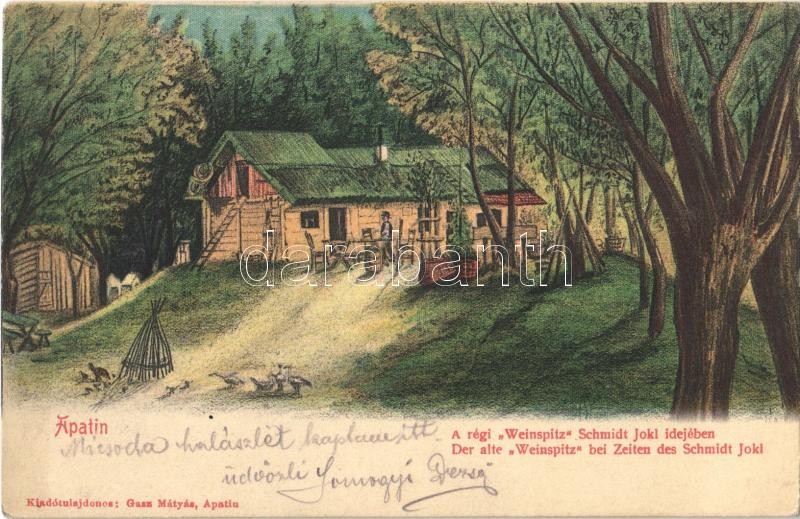 1906 Apatin, A régi "Weinspitz" Schmidt Jokl idejében. Gasz ... https://www.darabanth.com/hu/361-Gyorsarveres/361.0/Kepeslapok/Vajdasag~1500011/1906-Apatin-A-regi-Weinspitz-Schmidt-Jokl-idejeben-Gasz-Matyas-kiadasa-old-restaurant~II2079399