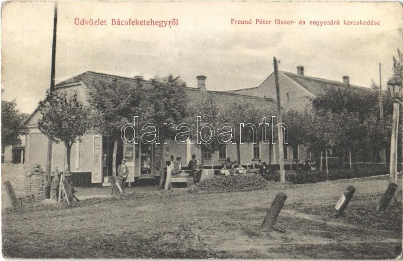Leírás: Bácsfeketehegy, Feketic; Freund Péter fűszer és vegyesárú kereskedése és saját kiadása / shop