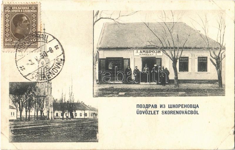 Leírás: Székelykeve, Skorenovac; Római katolikus templom, Ambrozy J. üzlete. Theod. Rechnitzer kiadása / Catholic church, shop of Ambrozy