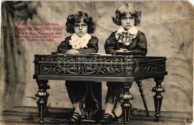 A világ legkisebb művészei, Meggyessi Jancsika és Zolkó, a 3 és 4 éves, főhercegek által kitüntetett cimbalom, tubafon és xylofon művészek / The smallest artists of the World, the 3- and 4-year-old cimbalom, tubaphone and xylophone players (EM)