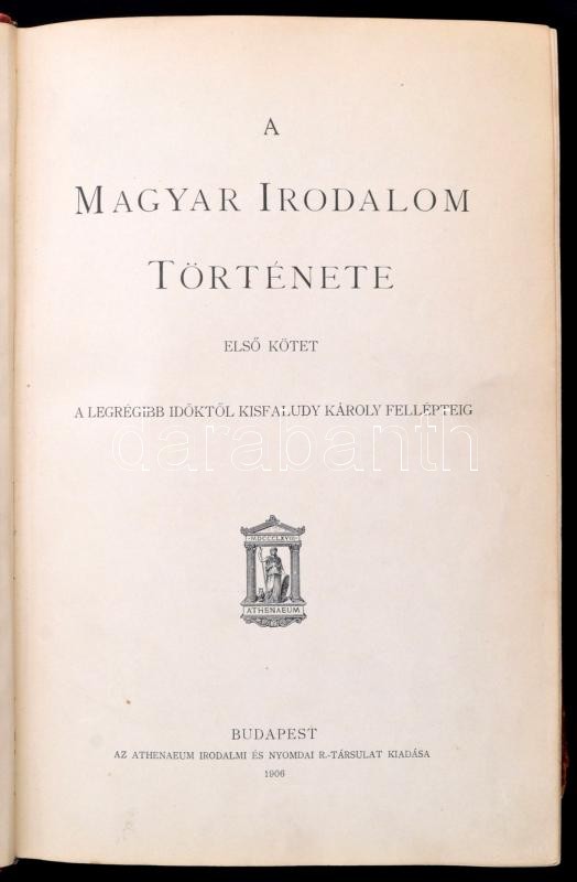 A magyar irodalom története I-II. kötet. Képes díszmunka két kötetben. Szerk.: Beöthy Zsolt, Badics Ferenc. I. kötet: A legrégibb időktől Kisfaludy Károly felléptéig. II. köt.: Kisfaludy Károly felléptétől a kiegyezésig. Bp., 1906-1907, Athenaeum. Harmadik javított és bővített kiadás. Kiadói aranyozott félbőr-kötés, kopott borítóval és gerinccel, a I. kötet gerincén kis folttal.