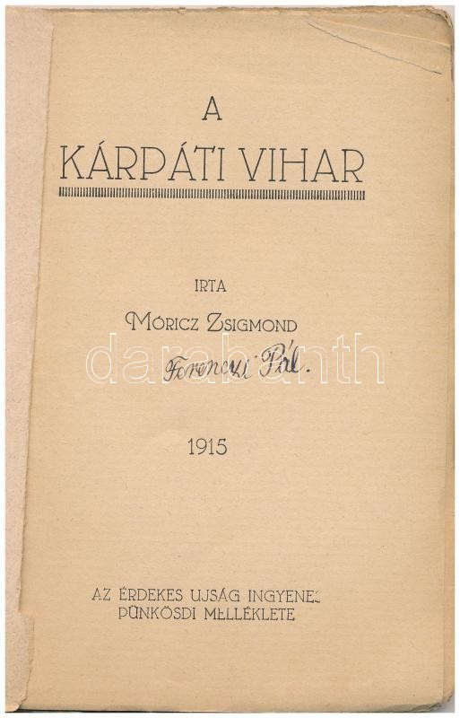 Móricz Zsigmond: A kárpáti vihar. 1915, Érdekes Újság. Kiadói papírköt... https://www.darabanth.com/hu/361-Gyorsarveres/361.0/Konyvek/Konyvek-Egyeb-ritkasagok~1000020/Moricz-Zsigmond-A-karpati-vihar-1915-Erdekes-Ujsag-Kiadoi-papirkotes-megviselt-allap~II2027468