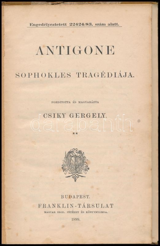 Szophoklész: Antigone. Sophokes tragédiája. Fordította és magyarázta: Csiky Gergely. Bp.,1899, Franklin,95 p. Átkötött félvászon-kötésben, kissé kopott borítóval, a szennylapok hiányoznak, egy lap kijár.