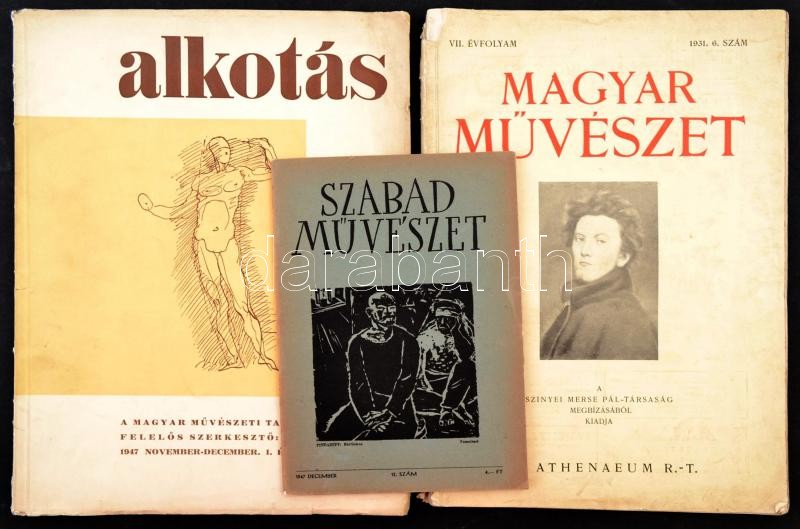 1931 Magyar művészet, VII. évf. 1931. 6 sz., 1947 Alkotás. Szerk.: Kassák Lajos. 1947. november-december. 1. évf. 11-12. sz., 1947 Szabad Művészet, Szerk.: Bortnyik Sándor, 1947. december. 1. évf. 12. sz. Változó állapotban, az egyik kissé szakadott gerinccel, a másik szakadozott borítóval, a gerinc részben elvált a borítótól, a harmadik jó állapotban.