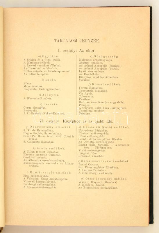 A legnevezetesebb korszakalkotó építészeti műemlékek gyűjteménye. Kézikiadás 62 szinnyomatu képpel sépia modorban magyarázó szöveggel. Bp., (1894.) Hölzel és Társa. 2 sztl.lev. 61 kőnyomatos t. (építészeti műemlékek) 120 p. Kiadói festett, illusztrált egészvászon kötésben, festett lapszélekkel, könyvjelzővel. Rendkívül ritka, nagyon szép állapotú könyv.