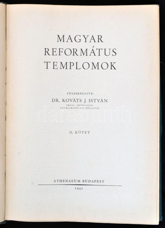 Magyar református templomok I-II. kötet. Szerk.: Dr. Kováts J. István. Bp., 1942, Athenaeum, 8+734 p. Kiadói aranyozott egészvászon-kötés, javított gerinccel.