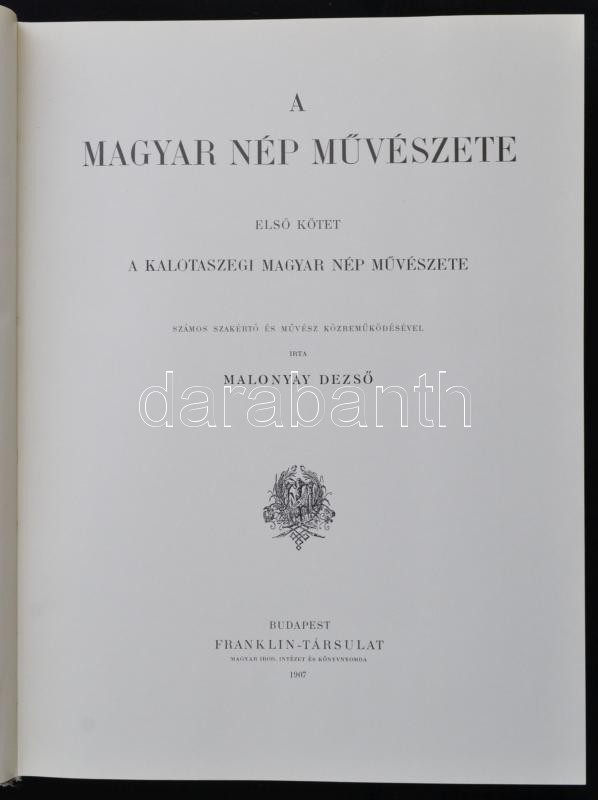 Malonyai Dezső: A magyar nép művészete I. Reprint. A kalotaszegi magyar nép művészete. Bp., 1909, Franklin-Társulat (1985, Helikon). Hasonmás kiadás számos képpel, műmelléklettel és színes táblával, kiadói festett aranyozott egészvászon kötésben, szép állapotban tékával