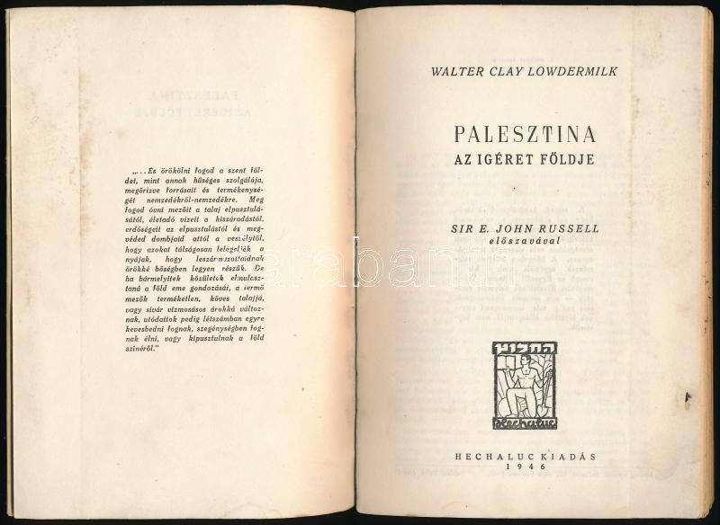Walter Clay Lowdermilk: Palesztina. Az igéret földje. Sir. E. John Russell előszavával. Fordította: Lőw Éva. Bp., 1946, Hechaluc,(Bp. Igazság-ny.), 181+2 p. Első kiadás. Kiadói papírkötés, kissé foltos.
