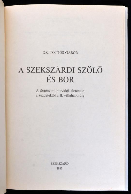 Dr. Töttős Gábor: A szekszárdi szőlő és bor. A történelmi bordvidék története a kezdetektől a II. világháborúig. Szekszárd, 1987, Szekszárdi Nyomda. Kiadói egészvászon-kötés, kiadói papír védőborítóban.