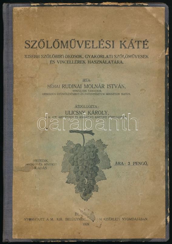 Rudinai Molnár István: Szőlőművelési káté. Kisebb szőlőbirtokosok, gyakorlati szőlőművesek és vincellérek használatára. Átdolgozta: Ulicsny Károly. Bp.,1929, M. Kir. Belügyminisztérium Kísérleti Nyomdája, 105+1 p. Átkötött kopott félvászon-kötésben, egy lap szakadt.+1948-1951 Egybekötve: a Földművelésügyi Minisztérium 5 db különféle növényvédelmi nyomtatványával.+További 2 db növényvédelmi prospektussal.