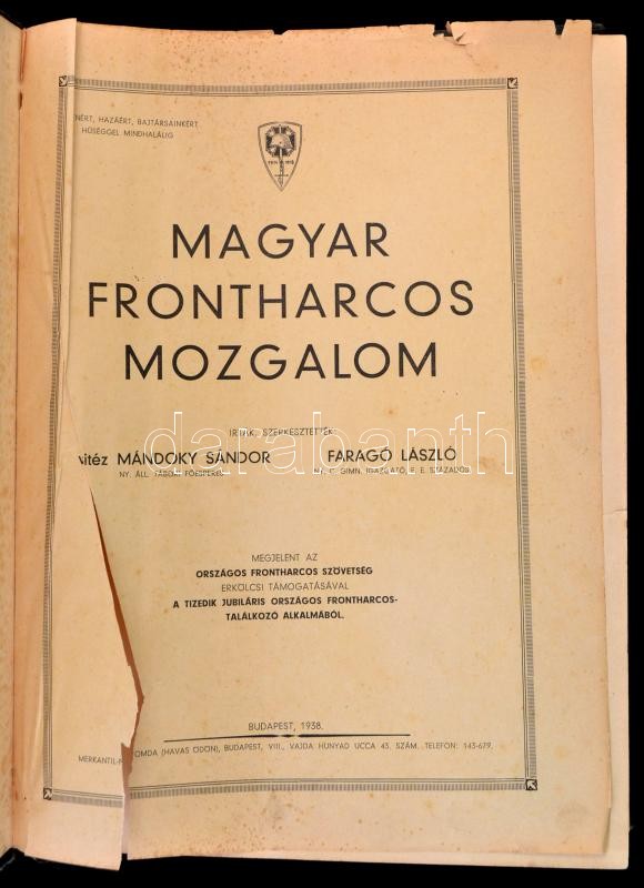 vitéz Mándoky Sándor-Faragó László: Magyar Frontharcos Mozgalom. Megjelent az Országos Frontharcos Szövetség erkölcsi támogatásával a tizedik jubiláris országos frontharcostalálkozó alkalmából. Bp., 1938, Merkantil-Nyomda, 740 p. Kiadói aranyozott, dombornyomásos, egészvászon kötés, kopott borítóval, kissé laza fűzéssel, foltos szennylapokkal, szakadt címlappal.
