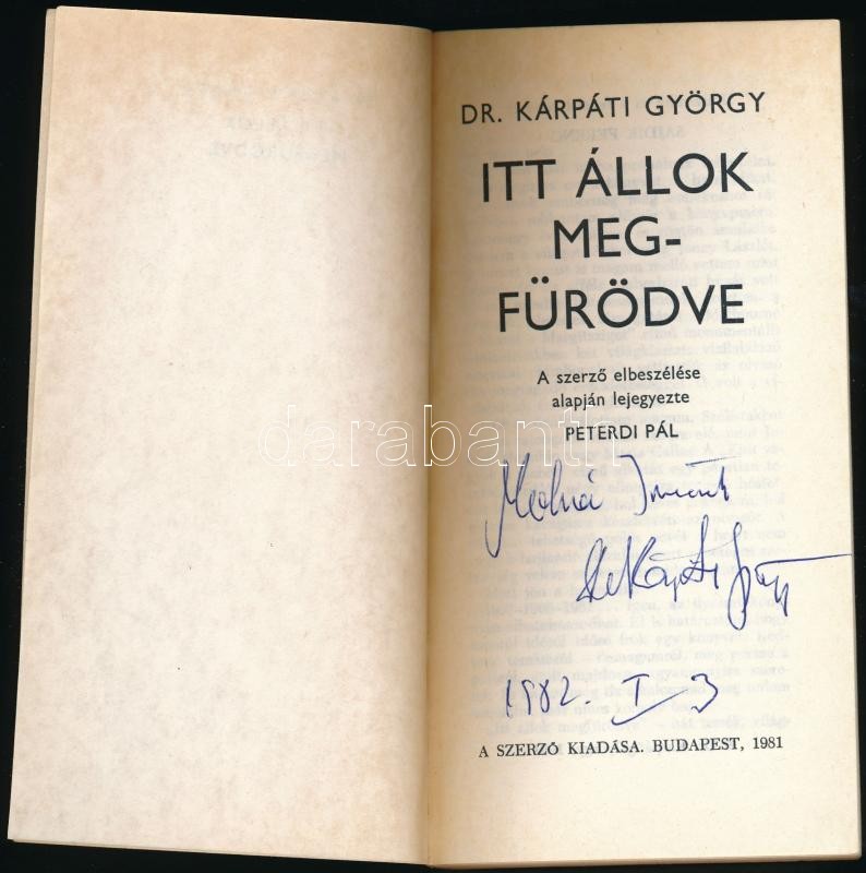 Dr. Kárpáti György: Itt állok megfürödve. A szerzÅ‘ elbeszélése alapján lejegyezte: Peterdi Pál. Sajdik Ferenc illusztrációival. Bp.,1981, SzerzÅ‘i kiadás. Kiadói papÃrkötés. A szerzÅ‘ által dedikált.