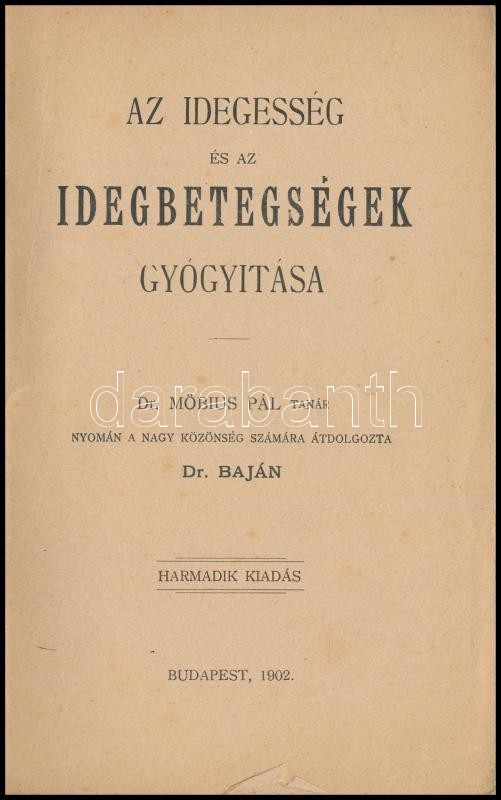 Dr. Möbius Pál: Az idegesség és az idegbetegségek gyógyítása. - - tanár nyomán a nagy közönség számára átdolgozta Dr. Baján. Bp.,1902, (Fritz Ármin-ny.), 61+1+2 p. Harmadik kiadás. Kissé foltos papírkötésben, a gerincen kis hiánnyal.