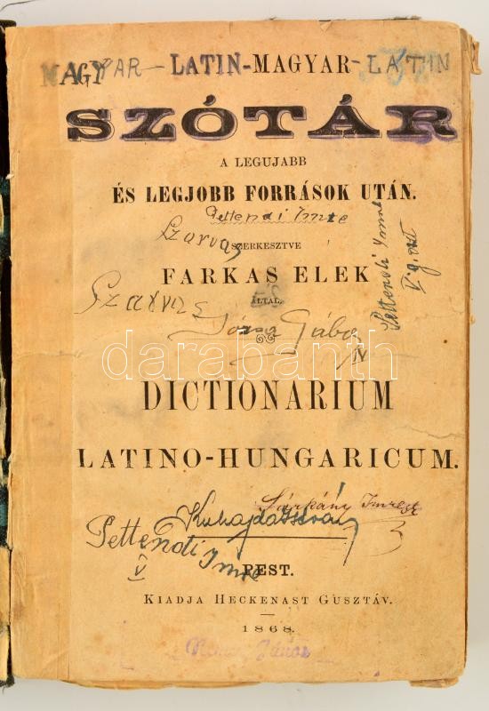 Latin-magyar szótár a legujabb és legjobb források után. Dictionarium Latino-Hungaricum. Szerk.: Farkas Elek. Pest, 1868, Heckenast Gusztáv, 508 p. Átkötött félvászon-kötésben, kopott borítóval, sérült gerinccel, laza fűzéssel, javított, kissé foltos lapokkal, hiányzó szennylapokkal, intézményi bélyegzőkkel, megviselt állapotban.