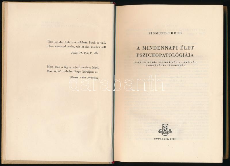 Sigmund Freud: A mindennapi élet pszichopatológiája. Bp.,1958, Bibliot... https://www.darabanth.com/hu/361-Gyorsarveres/361.0/Konyvek/Konyvek-Tarsadalomtudomany~1000012/Sigmund-Freud-A-mindennapi-elet-pszichopatologiaja-Bp-1958-Bibliotheca-Kiadoi-felvaszon-k~II2048426