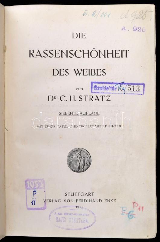 Dr. C. H. Stratz: Die Rassenschönheit des Weibes. Stuttgart, 1911, Ferdinand Enke,1 t.+XVI+443 p. Német nyelven. Fekete-fehér fotókkal gazdagon illusztrált. Későbbi átkötött félvászon-kötés, kopott borítóval, kissé sérült gerinccel.