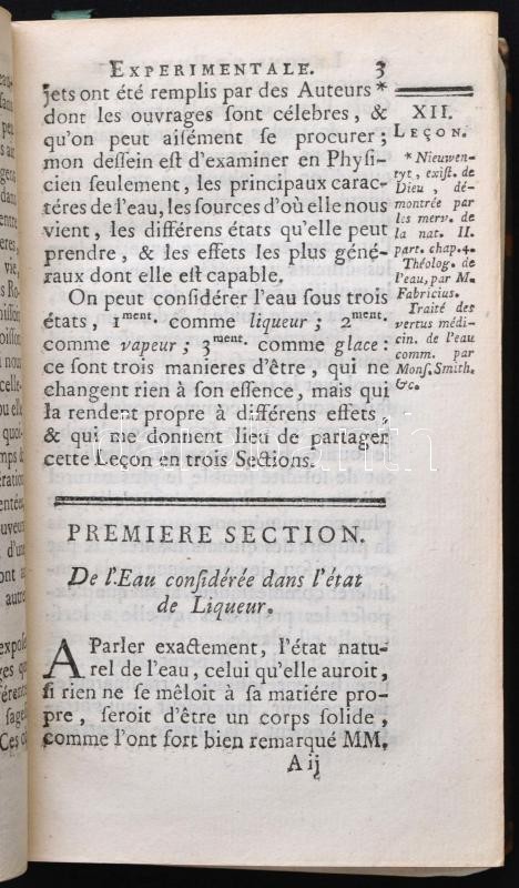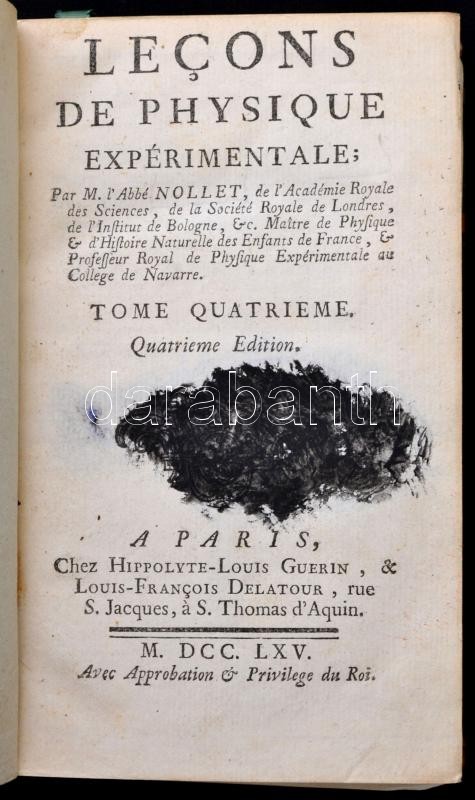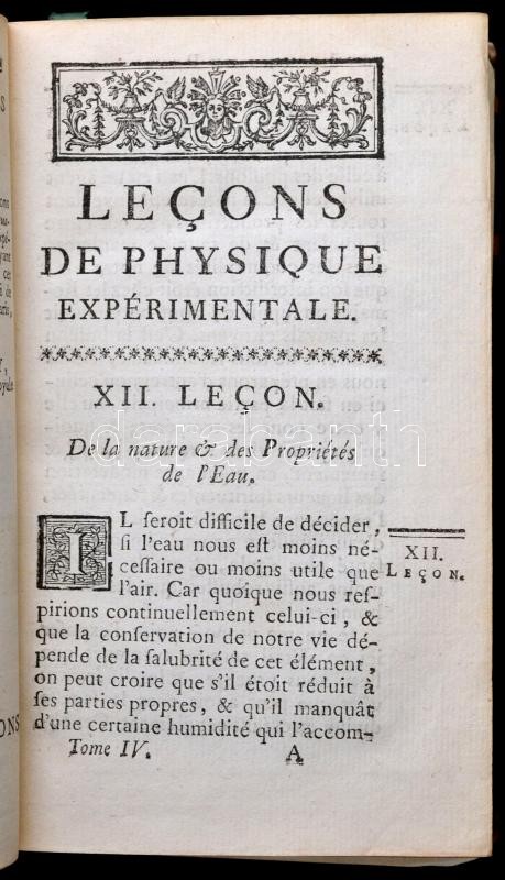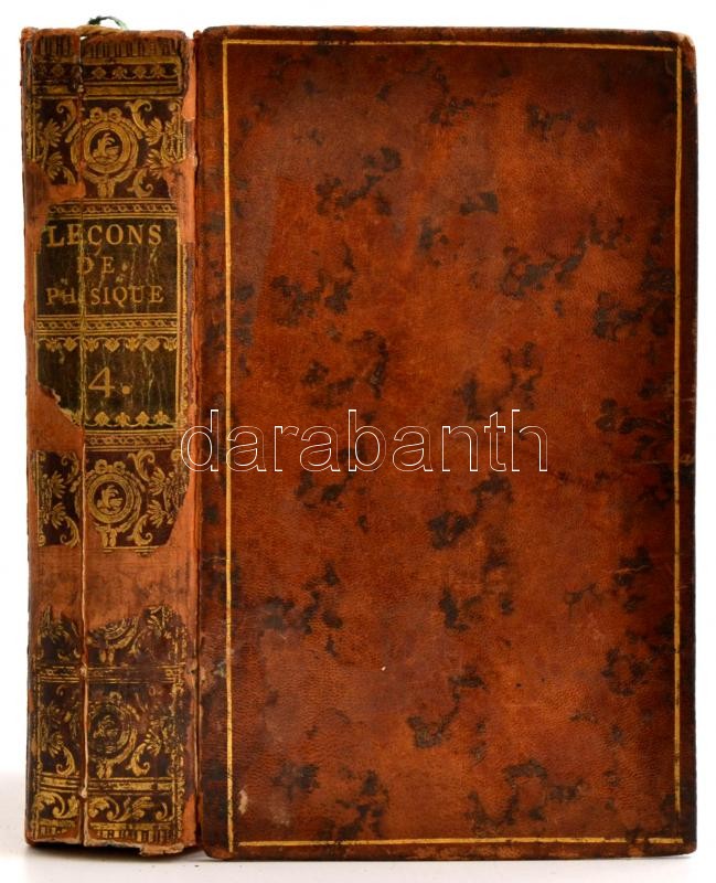 Nollet, Jean-Antoine (1700 -1770): Leçons de Physique expérimentale. Tome Quatrieme. Paris, 1759, Hyppolyte-Louis Guerin-Louis-Francois Delatour,4+536 p.+14 t. kihajtható rézmetszetű tábla. Francia nyelven. Negyedik kiadás. Korabeli dúsan aranyozott gerincű egészbőr-kötés, aranyozott lapélekkel, kopott gerinccel, a gerincen apró sérüléssel, a címlapon tintafolttal, az utolsó oldal (535/536) részben hiányos.