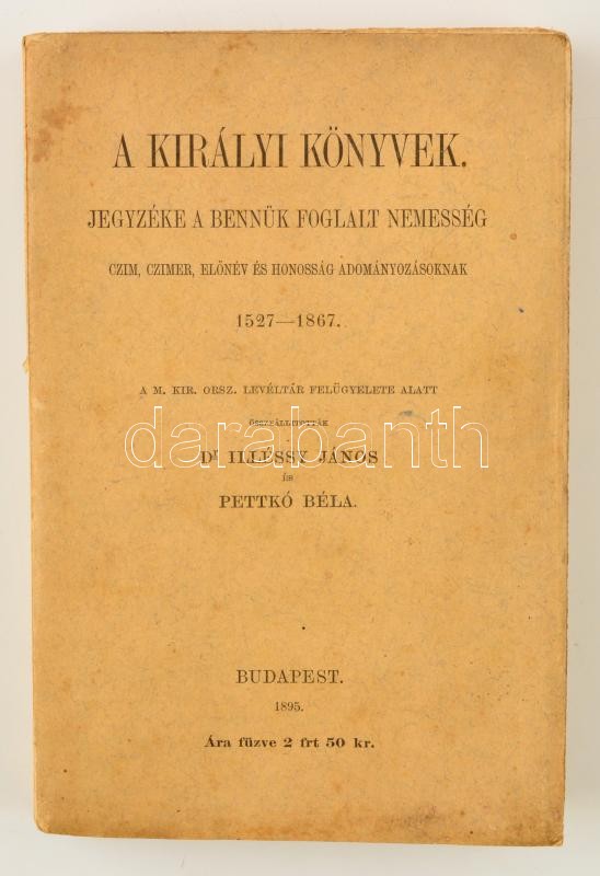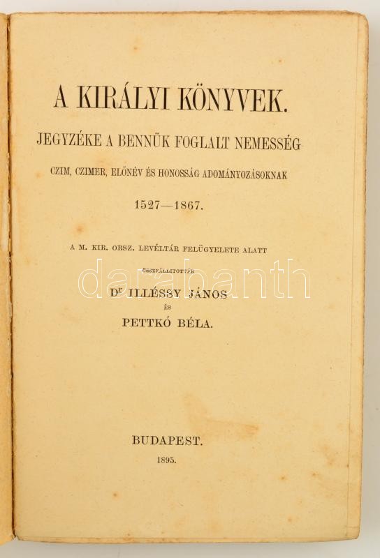 A királyi könyvek jegyzéke a bennük foglalt nemesség, cím, címer, előnév és honosság adományozásoknak. 1527-1867. Összeáll.: Dr. Illésy János, Pettkó Béla. Bp.,1895, Franklin, 288 p. Kiadói papírkötés, kissé sérült gerinccel.