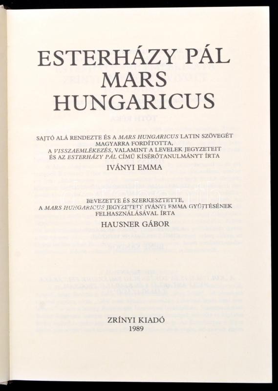Esterházy Pál: Mars Hungaricus. Sajtó alá rendezte, a 'Mars Hungaricus' latin szövegét magyarra fordította, a 'Visszaemlékezés', valamint a levelek jegyzeteit és az Esterházy Pál című kísérőtanulmányt írta: Iványi Emma. Bevezette és szerkesztette, a 'Mars Hungaricus' jegyzetei Iványi Emma gyűjtésének felhasználásával írta: Hausner Gábor. Zrínyi-Könyvtár. III. Bp.,1989, Zrínyi. Kiadói kartonált papírkötés.