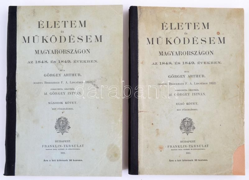 Görgey Arthur: Életem és működésem Magyarországon az 1848. és 1849. években. 1-2. köt. (Kiadta Brockhaus F. A. Lipcsében 1852.) Ford.: id. Görgey István. Bp.,1911, Franklin, XVI+294; VII+423 p.+ 1 t. (kihajtható térkép.) Kiadói papírkötés, javított gerinccel, a borítókon kis szakadásokkal, az I. kötet elülső borítója javított, a II. kötetben 3 lapon ceruzás aláhúzásokkal.