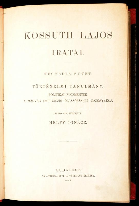 Kossuth Lajos Iratai. IV. kötet: Történelmi tanulmány: Történelmi tanulmány. Politikai előzmények a magyar emigráció olaszországi viszonyához. Sajtó alá rendezte: Helfy Ignác. Bp.,1894, Athenaeum, XXI+552 p. Átkötött aranyozott gerincű félvászon-kötés, kopott borítóval, jó állapotban.
