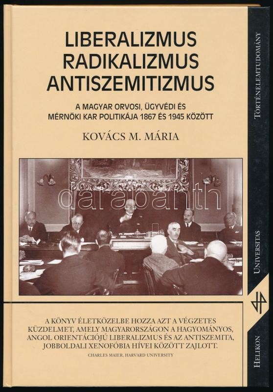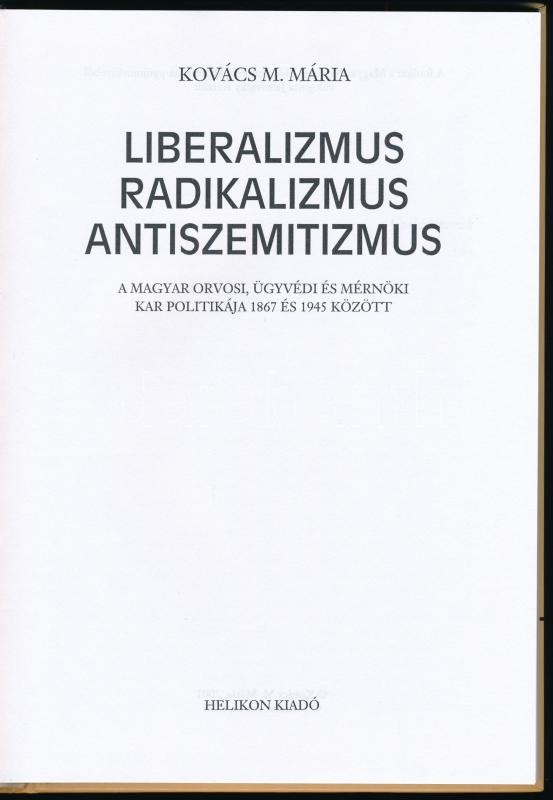 Kovács M. Mária: Liberalizmus, radikalizmus, antiszemitizmus. A magyar orvosi, ügyvédi és mérnöki kar politikája 1867 és 1946 között. Bp.,2001,Helikon. Kiadói kartonált papírkötés.