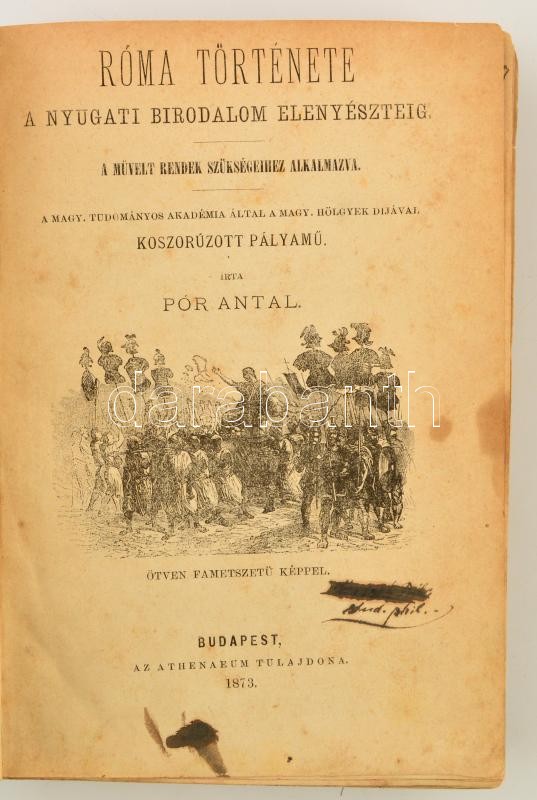 Pór Antal: Róma története a nyugati birodalom elenyészeteig. Bp.,1873, Athenaeum, 1 t.+VI+454+2 p. Átkötött félvászon-kötésben, kopott borítóval, tulajdonosi névbejegyzésekkel.