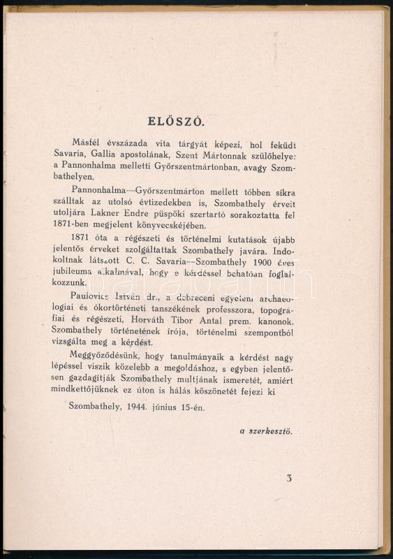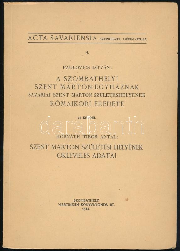 Acta Savariensia 4.: Paulovics István: A szombathelyi Szent Márton-egyházának savariai Szent Márton születésének rómaikori eredete.; Horváth Tibor Antal: Szent Márton születési helyének okleveles adatai. Szombathely, 1944, Martineum. Kiadói papírkötés.
