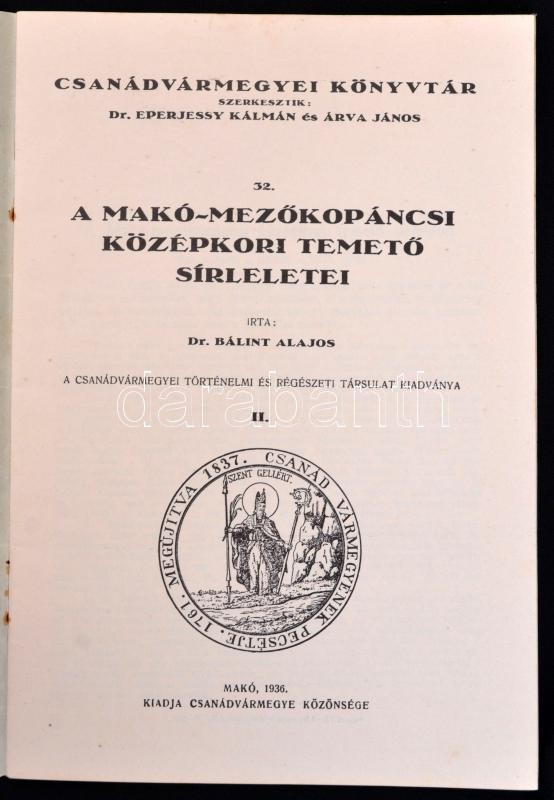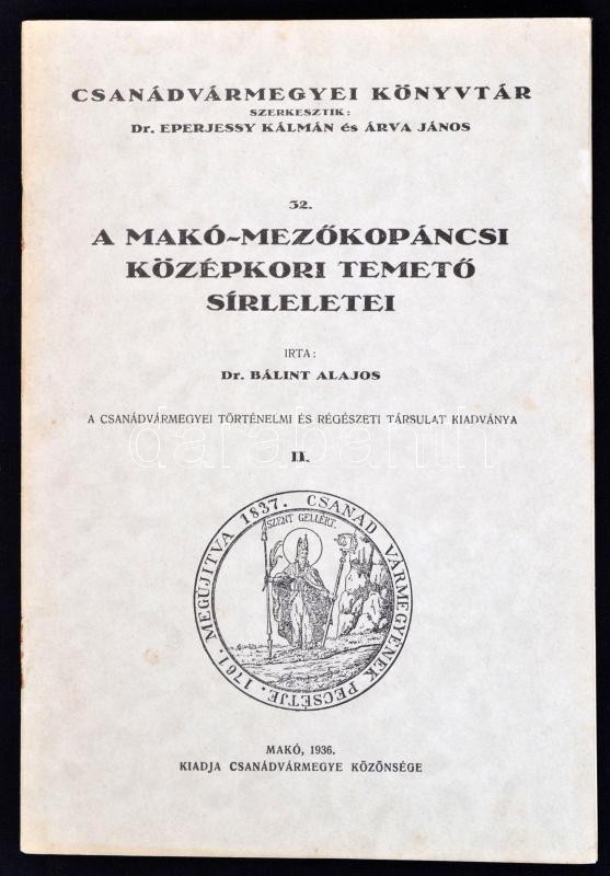 Dr. Bálint Alajos: A makó-mezőkopáncsi középkori temető sírleletei. Csanádvármegyei Könyvtár. 39. Makó, 1936, Csanádvármegye Közönsége, (Szeged Városi Nyomda és Könyvkiadó Rt., Szeged), 20 p.+2 t. Kiadói papírkötés.