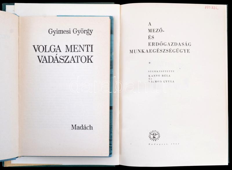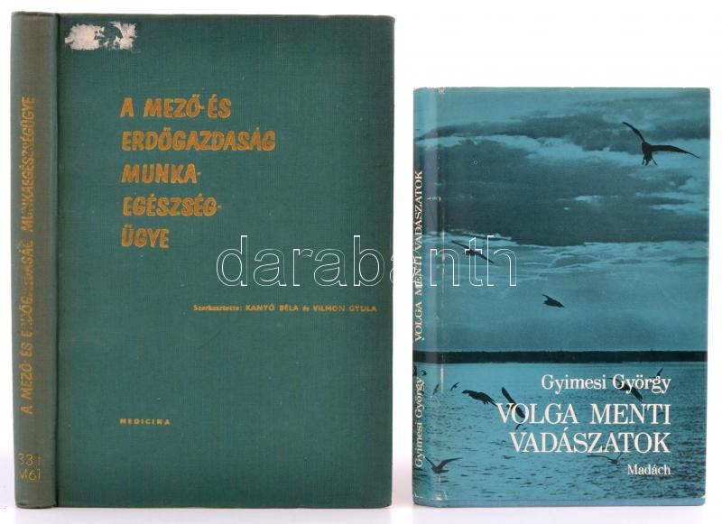 Leírás: Gyimesi György: Volga menti vadászatok. Pozsony,1985,Madách. Kiadói egészvászon-kötés, kiadói papír védőborítóban. + A mező- és erdőgazdaság munkaegészségügye. Szerk.: Kanyó Béla, Vilmon Gyula. Bp., 1963, Medicina. Kiadói aranyozott egészvászon-kötés, intézményi bélyegzővel.