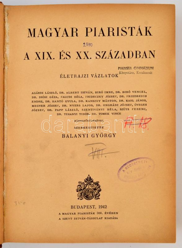 Balanyi György: Magyar piaristák a XIX. és XX. században. Életrajzi vázlatok. Szerkesztette: - -. Bp.,1942, Szent István-Társulat, 465+3 p. Egyetlen kiadás. Átkötött félvászon-kötés, kissé kopott borítóval, intézményi bélyegzővel.