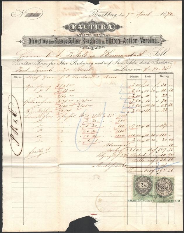 1870 Ruszkberg/Ruszkabánya, Factura von der Direction des Kronstädter Bergbau u. Hütten-Actien-Vereins fejléces számlája, 2 Kr. és 3 Kr. határőrvidéki okmánybélyegekkel.