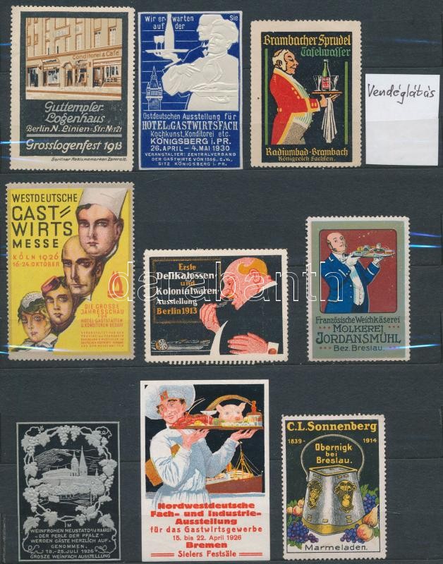 Leírás: Vendéglátás témájú levélzáró gyűjtemény egy albumlapon / Catering poster stamps