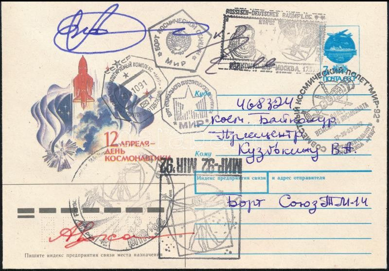 Alekszandr Viktorenko (1947- ), Alekszandr Kaleri (1956- ) szovjet és Klaus-Dietrich Flade (1952- ) német űrhajósok aláírásai emlékborítékon / Signatures of Aleksandr Viktorenko (1947- ), Aleksandr Kaleri (1956- ) Soviet and Klaus-Dietrich Flade (1952- ) German astronauts on envelope