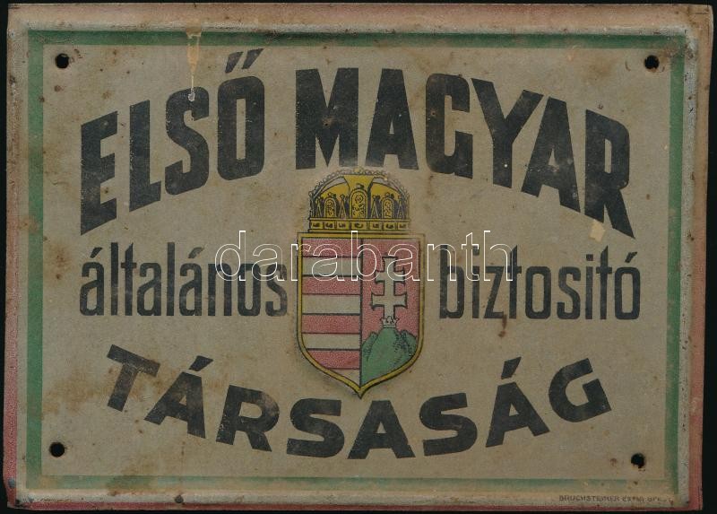 Leírás: Első Magyar Általános Biztosító Társaság, koronás kiscímerrel, festett fémtábla, Bp., Bruchsteiner és Fia-ny., kopásnyomokkal, folttal, 9x13 cm