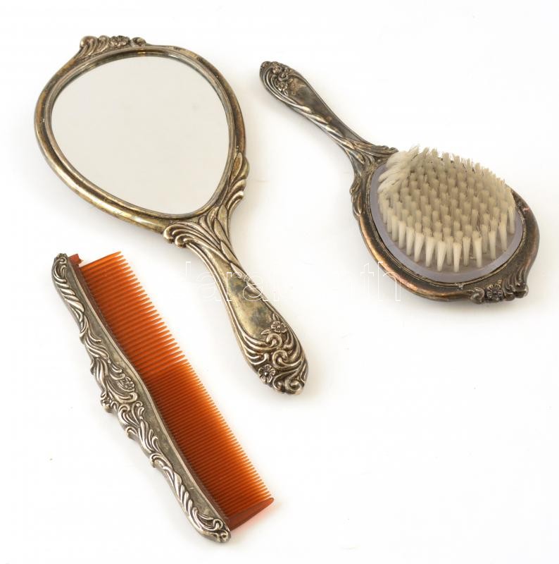 Leírás: Kézi tükör és kefe, fésű, szecessziós stílusú, 3 db, h: 21 és 27 cm