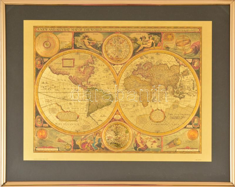 Leírás: New and accurat map of the world 1651. térkép modern aranyozott díszkiadása üvegezett keretben 51x40 cm