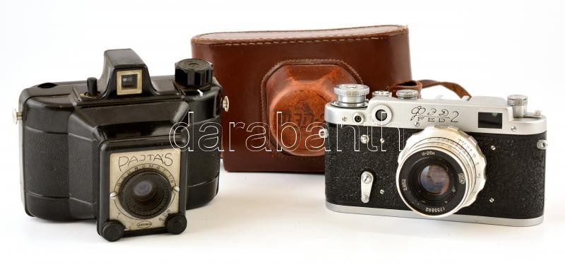 Leírás: cca 1960 FED-2 (d) szovjet távmérős fényképezőgép, Industar-26m 52mm f/2.8 objektívvel, eredeti bőr tokjában, működőképes állapotban.+Gamma Pajtás fényképezőgép, Achromat 1:8/80 mm objektívvel, 6x6 cm filmformátum, hiányos (piros fényszigetelő lapka), kis lepattanással.