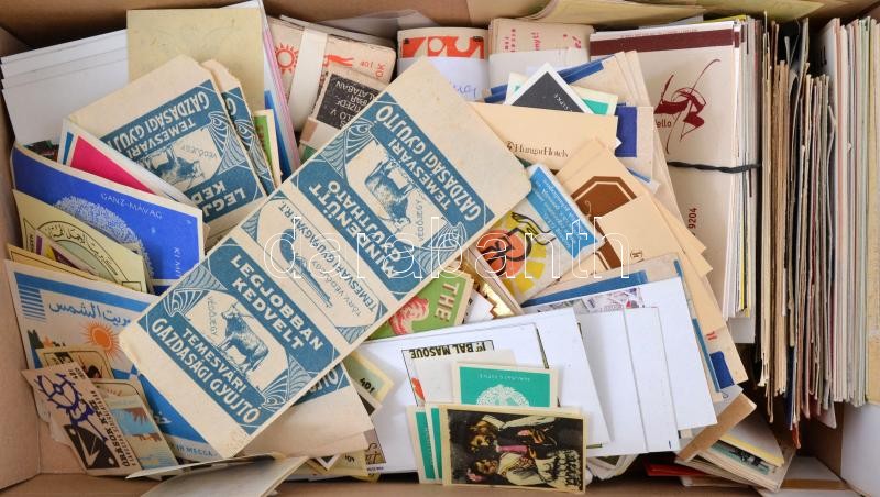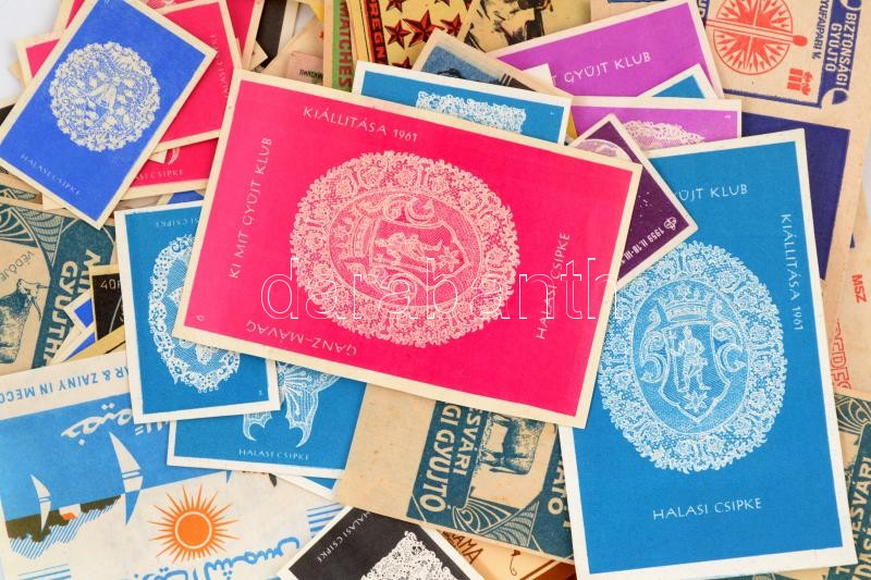 Leírás: Több ezer darabos gyufacímke kötegelve és ömlesztve
