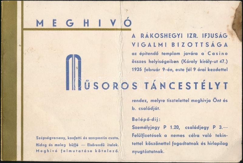 Leírás: 1935 Meghívó a Rákoshegyi Izr. Ifjúság Vigalmi Bizottsága által rendezett műsoros táncestélyre
