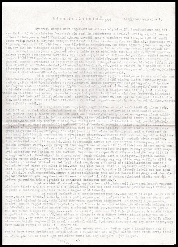 1943 Lukács Elemér karpaszományos őrmester két oldalas sűrűn gépelt levele Lengyelországból, valószínűleg Zakopaneból, érdekes részletekkel a pazarul felszerelt, korábban zsidó tulajdonú, akkora elhagyott villákról
