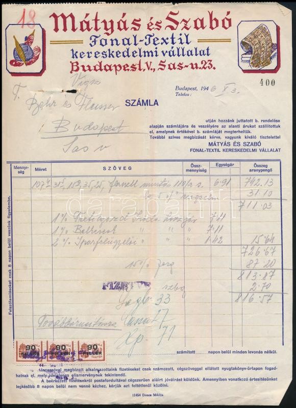 Leírás: 1946 Bp.V., Mátyás és Szabó Fonal-Textil Kereskedelmi Vállalat által kiállított fejléces számla