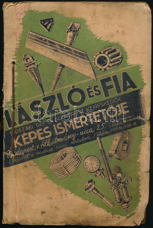 Leírás: cca 1930 László és fia Alktomány ucca műszaki alkatrész bolt képes árjegyzék, foltos címlappal, ceruzás bejegyzésekkel.